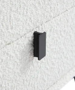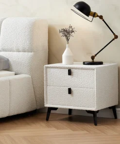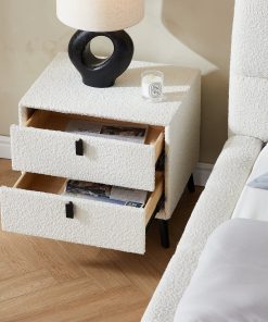 This nightstand features a chic boucle fabric design. adding a soft. textured touch to your bedroom. The creamy color palette complements its minimalist modern style. making it a perfect addition to contemporary interiors. With a practical double-drawer design. it offers ample storage space while maintaining a sleek. elevated look thanks to its high legs. A beautiful blend of form and function. this nightstand brings both style and convenience to your space.